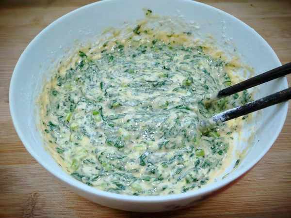 食材:茼蒿一把、雞蛋3個、面粉適量,鹽、胡椒粉少量。