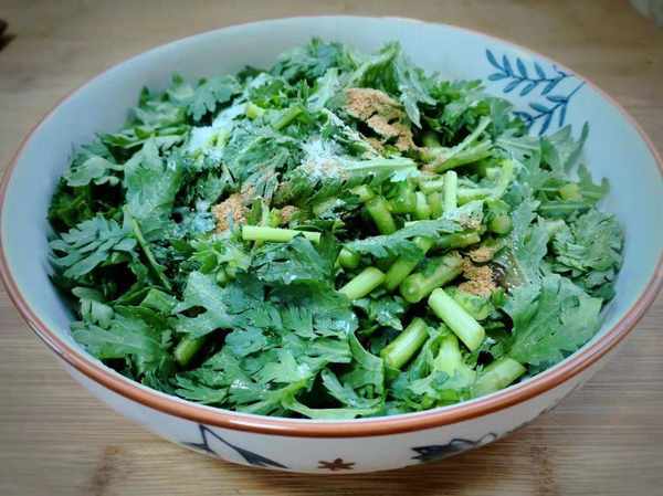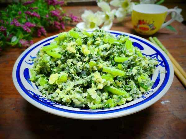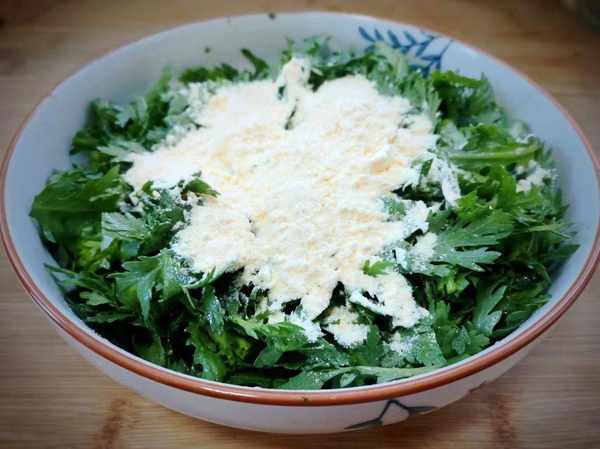 4、在籠屜上放入裹好粉的茼蒿,大火燒開蒸鍋內的水,蓋上蓋大火蒸6分鐘左右,蒸好的茼蒿放在大點的盆子裡,趁熱用筷子挑散,調自己喜歡的料汁,淋在茼蒿上面拌勻就可以吃瞭,又是主食又是菜。