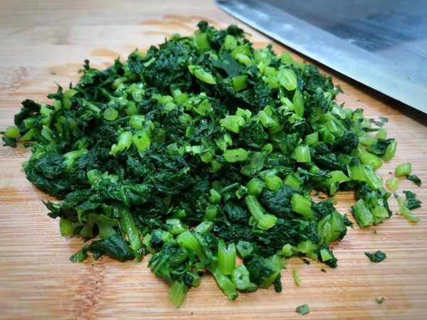 2、在鍋中加水,水燒開放入洗凈的茼蒿焯水1分鐘,撈出過一遍涼水,輕輕擠掉水分,將茼蒿切小丁,稍微碎一點更加好。