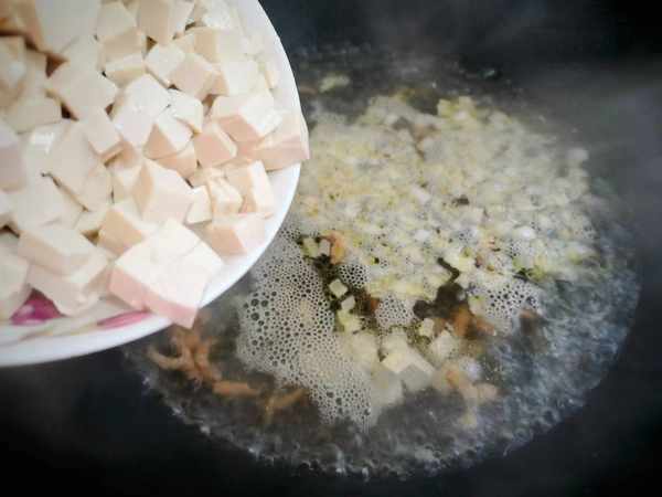 4、直接加入適量清水,大火煮開,倒入豆腐丁煮幾分鐘,湯色略發白瞭,豆腐變嫩變白瞭,也就可以瞭。