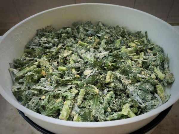 食材:茼蒿、面粉、玉米粉、食用油、鹽、五香粉。