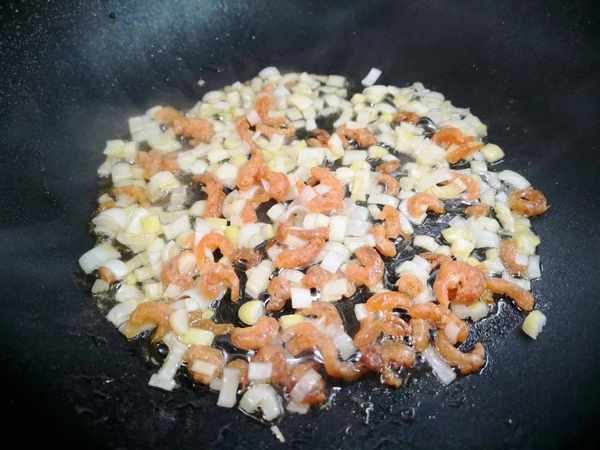 3、小蝦米沖洗後,放入水中浸泡一會泡軟,蔥段洗凈改刀成切條再切成蔥花,熱鍋冷油,放蔥花爆香,放入蝦米炒至開始變色,能聞到蝦米的香味。