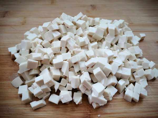 2、做湯選用豆腐,可以水豆腐或者內脂豆腐,口感更滑嫩,豆腐沖洗後,切成小丁備用。