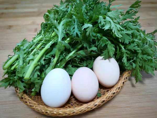 做法:1、新鮮的茼蒿一把,雞蛋3個,食材量根據傢人的食用量增減,茼蒿先用鹽水浸泡幾分鐘,再多沖洗幾遍。