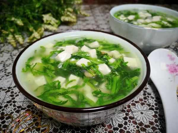 食材:茼蒿、豆腐、蝦米、蔥、鹽、胡椒粉。