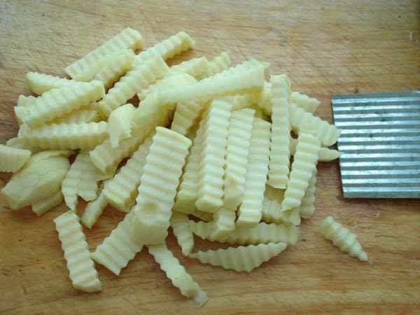 用花刀切成狼牙,用水洗去淀粉。