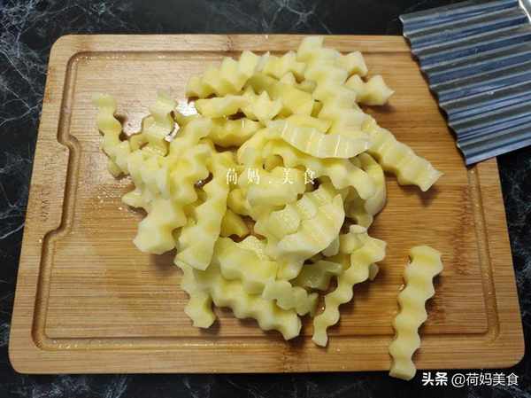 土豆去皮,用波紋刀切厚片,然後換刀切條。