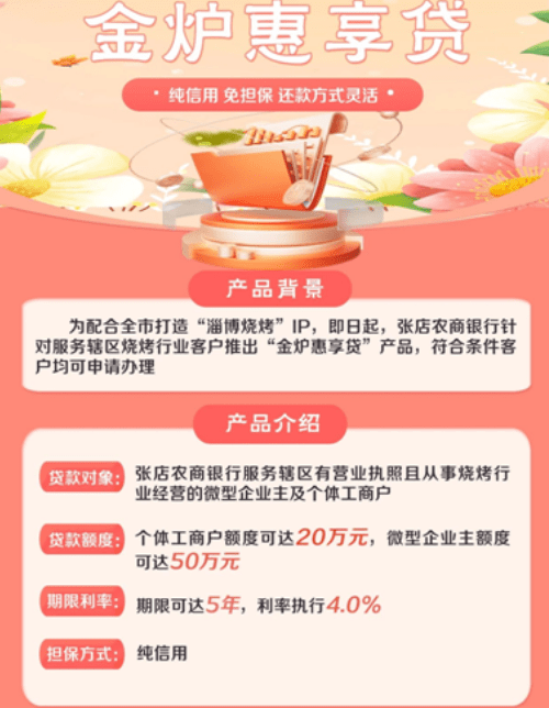 張店農商銀行推出的“金爐惠享貸”產品,服務淄博市張店區轄區有營業執照且從事燒烤行業經營的個體工商戶和微型企業主,利率低至4.0%,期限最長可達5年。