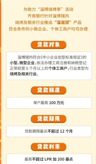 又比如齊商銀行推出“淄滋貸”。這個讓人有美好聲音聯想的貸款,其實是向符合條件的燒烤及相關行業內個體經營者、小微企業發放經營性貸款,單戶最高可貸100萬元。