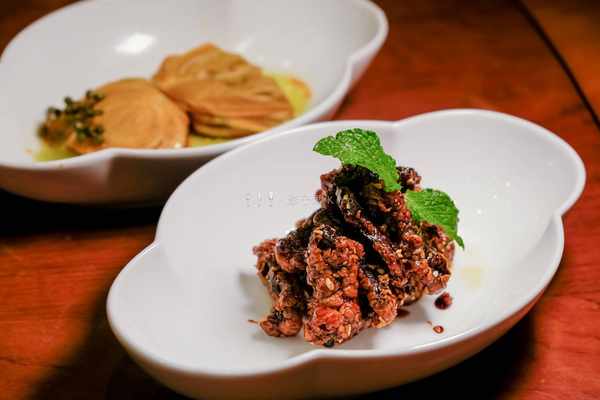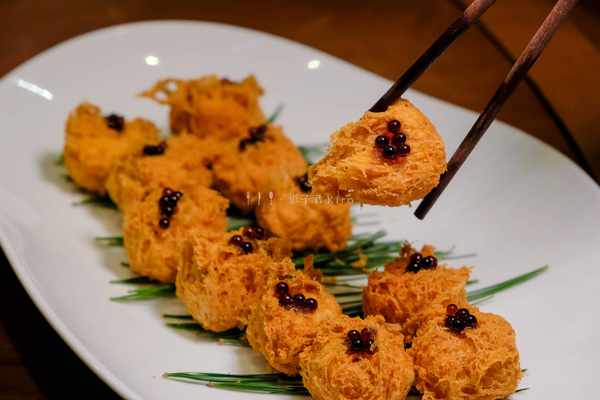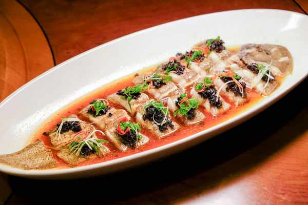 醬香老菜脯蒸龍舌,鮮嫩的龍舌魚切段,搭配黑色的老菜脯,入味咸香的同時帶給我們一種古早的菜脯味,很特別的搭配!香酥白玉配意大利醋粒,外表金黃酥脆,但是不咬下去你永遠不知道裡面有啥驚喜等著你,原來裡面是豆腐和絲丁魚拌一起的的“白玉”,鮮嫩潔白,點綴以小小醋粒,讓白玉味道更為凸顯,恰到好處。