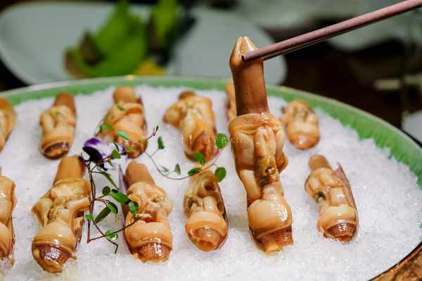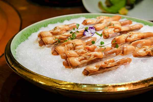 頭盤上的是味淋竹蟶王,可能照片看著不顯大,但是其實一個竹蟶王足足有十公分左右長度,十分的肥厚飽滿!口味像是鹵過的那種味道,吃起來脆嫩相間,咸香好吃,私以為如果抹點芥末會 更加好吃,當然這個因人而異瞭。