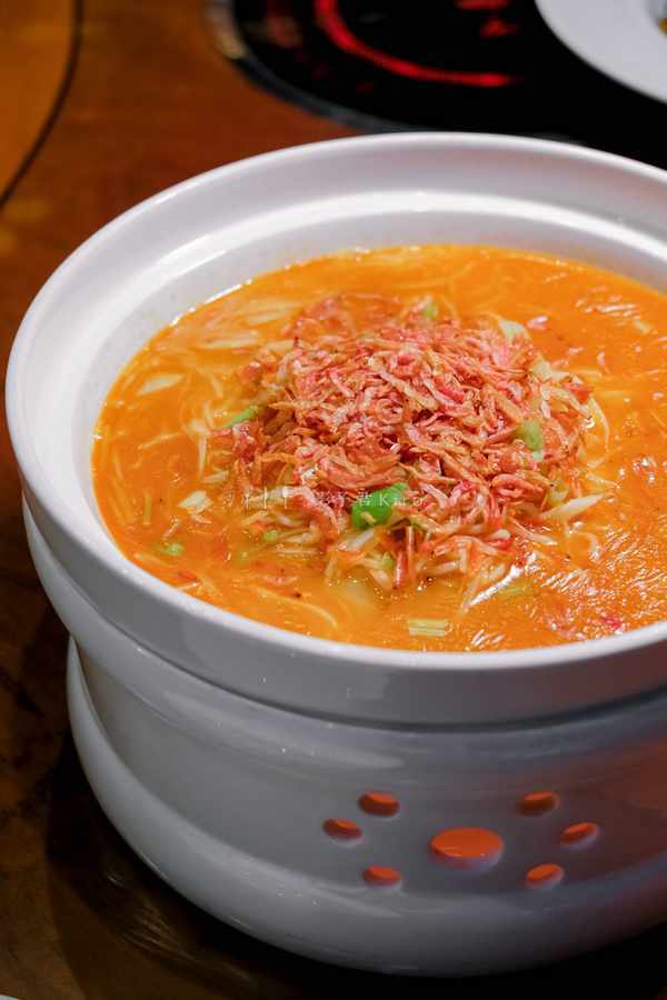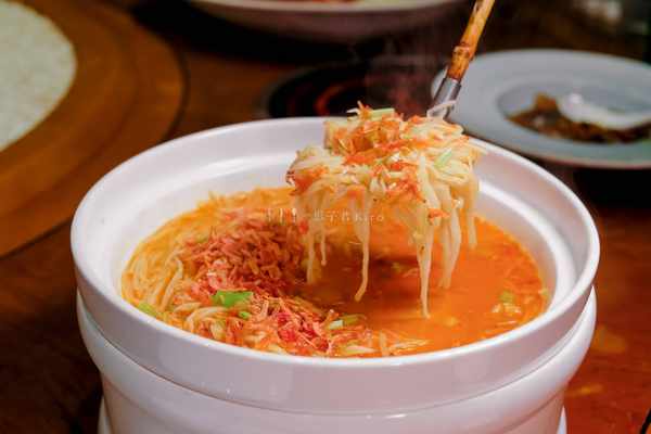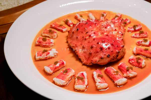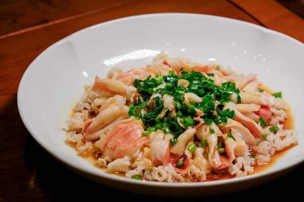 豉油韭香浸小蚌,繡球菌做底,蓋上切片蚌肉,撒上韭菜段,淋上香噴豉油,油光發亮,色香味俱全。金不換海瓜子炒蟹身乍一看顏值不咋滴,但是卻是我最喜歡的一道菜瞭,是采用去殼的海瓜子搭配蟹肉碎的一道小炒,滿滿都是肉滿滿都是鮮,巨好吃巨費工夫的一道菜,真的,拜托你一定要點它!龍皇湯櫻花煮茭白,也是一道顏值頗高的菜,茭白絲煮湯搭配鮮甜櫻花蝦,整個湯頭呈現橙紅色,十分誘人,喝起來也是鮮甜無比!