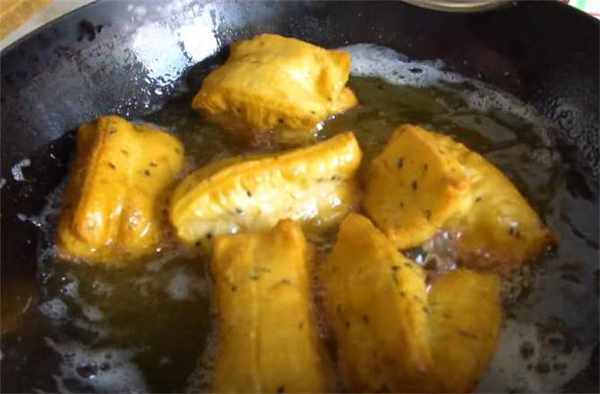 7.油溫六成熱下鍋,炸到兩面金黃浮起出鍋。