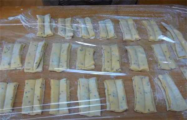 4.刷一層水,每一張都像這樣對折過去,今天咱們炸個小油條,再對半切開。