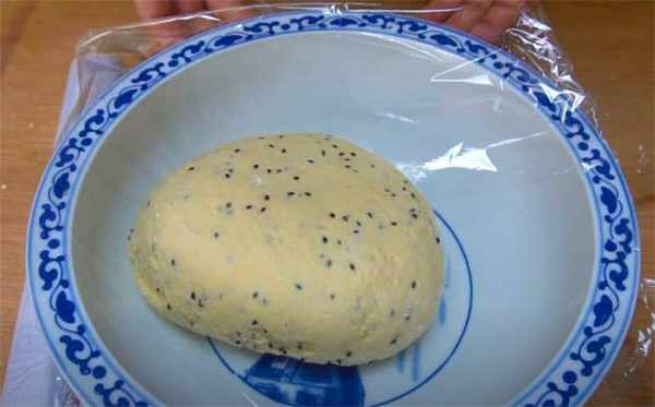 1.準備500g的面粉,5g的酵母粉,5g的食鹽,4g的小蘇打,然後用溫水開始和面,攪拌成面絮,加一些黑芝麻,揉成一個柔軟光滑的面團,蓋上保鮮膜發酵40分鐘左右。