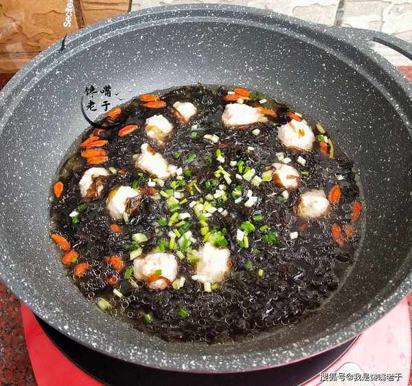 步驟四:當蝦丸煮熟後,放入適量的紫菜,老於我個人非常喜歡吃紫菜,所以加的量比較多,然後再撒上一把蔥花,淋入少許的香油,攪拌均勻後即可出鍋。