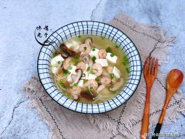 食材:鮮蝦、豆腐、香菇、蟹味菇、金針菇、蔥、薑、鹽、胡椒粉、香油、料酒