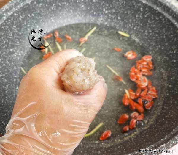 步驟二:鍋中加入適量的清水,水沸後先放入薑絲和少許的枸杞,接著加入適量的鹽和胡椒粉調味,水再次沸騰後改小火把蝦肉泥團成丸子,下入鍋中。