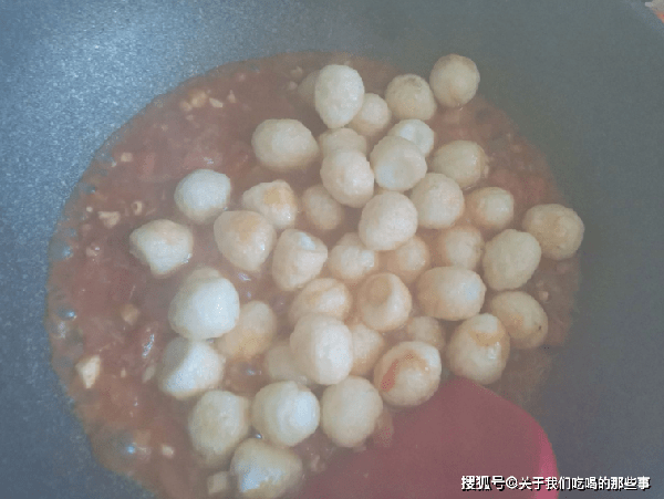 鍋裡倒入適量油,下入蔥花蒜末爆香,倒入西紅柿塊,小火煸炒出西紅柿汁,倒入調好的料汁攪拌均勻,大火煮至濃稠。