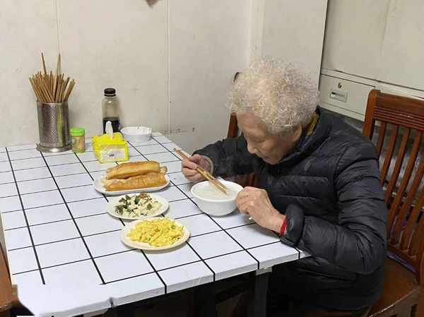 這會來的是桓奶奶,今年91歲瞭,習慣瞭早餐一杯豆漿或一份稀飯,坐在店裡的老位子上,慢慢地吃著,周圍來人瞭,就聊會天,“基本上天天來吃,因為我是一個人,沒有人燒飯,不方便,他們都很好對我們,生活上面都很照顧,有什麼困難問題就找他們。”