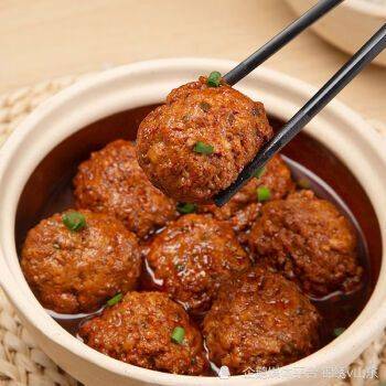(6)鍋底留油,放入小蔥、蒜瓣、八角煸炒出香味,再放入肉丸,倒入調好的紅燒汁,蓋上鍋蓋,燉煮至肉丸子熟透入味。