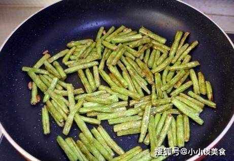 第三步,把所有的材料都準備好,把炒鍋放在火上,燒熱,放豆角,不用加油,開始小火慢炒。註意在豆子加工過程中有時需要用抹刀壓一下;