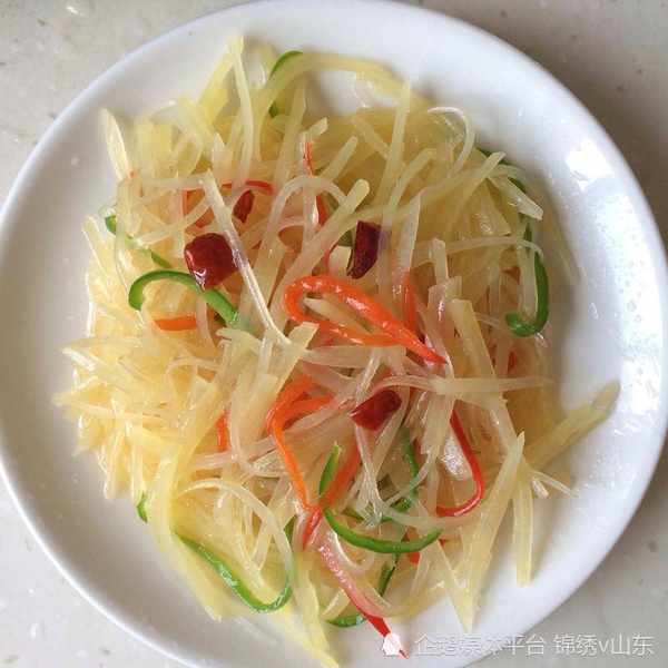 3.加入適量的食鹽、生抽和白醋,繼續大火翻炒,炒至土豆絲斷生後,即可出鍋開吃。