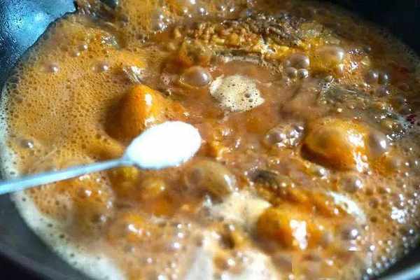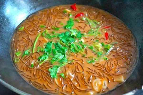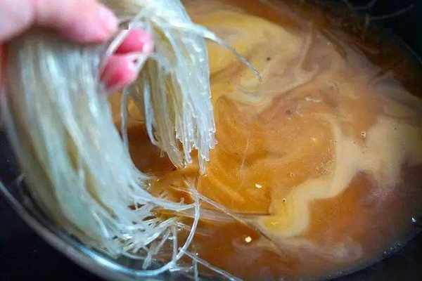 7、湯汁濃稠時加入鹽、雞精、胡椒粉調味,將魚撈出留下湯汁。4條、紅薯粉絲1把、蔥花8克、蒜片4克、生抽1湯匙、老抽數滴,生薑3片