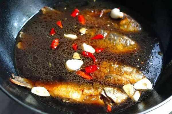 5、加入生抽、老抽後,燜1分鐘,魚上色即可。鯽魚4條、紅薯粉絲1把、蔥花8克、蒜片4克、生抽1湯匙、老抽數滴,生薑3片、