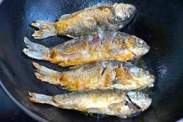4、將炒鍋上火燒熱,倒入油,放入鯽魚,開中小火煎魚,煎好一面翻過來再煎另一面。兩面都煎成微微金黃狀即可。