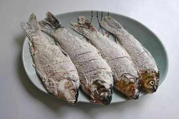 3、將處理幹凈的鯽魚裹上面粉,並抖掉多餘的面粉。裹面粉的好處是更容易煎,而且沒有腥味,魚肉的水分容易保留。