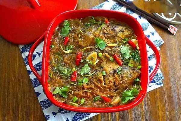 鯽魚4條、紅薯粉絲1把、蔥花8克、蒜片4克、生抽1湯匙、老抽數滴,生薑3片、紅辣椒4克、鹽適量