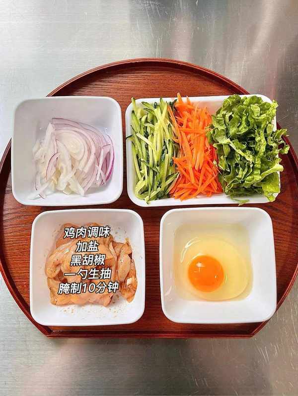 全麥餅一張,雞蛋一顆,雞肉,黃瓜,胡蘿卜,洋蔥.