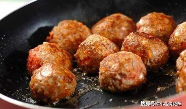 3、將肉揉成圓圓的丸子,鍋中加入少許油,將丸子先煎半炸。不需要多加油,更健康更好吃。大約5到10分鐘後,丸子基本熟透,散發出誘人的香味。