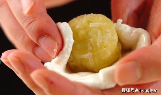 第三步:用小勺子舀出適量的紅薯泥,然後用雙手揉成一個乒乓球大小的球,做成餡。然後,將米面團切小塊,用搟面杖搟成合適的大小。把餡料放上去,用手揉搓封口。