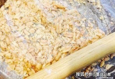 第二步,炸好的花生米上桌後,放涼用手揉搓紅衣,然後用搟面杖搟成花生米,再準備合適的面粉,放入鍋中,放上小火幹炒至面粉微黃;