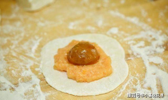 第六步:將餡料抹少許,讓包子的皮不要太薄,加入一勺鮮肉攤勻,然後在肉餡中加入一個咸蛋黃。