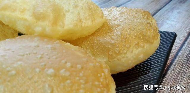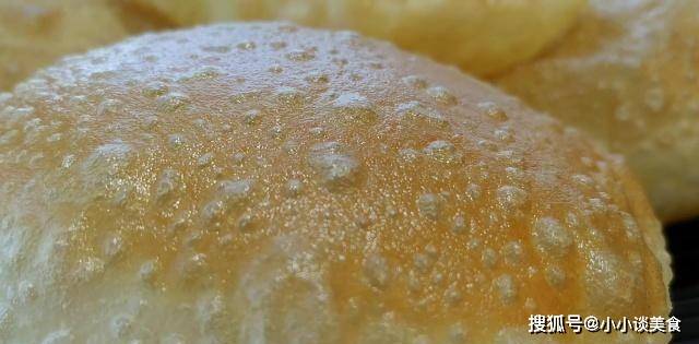 第三步,此時在鍋中倒入足量的油。油溫70%,下油鍋。邊煎邊不停地翻動和敲打派皮表面,很快就會形成大氣泡。然後用筷子翻面煎至另一面微黃。