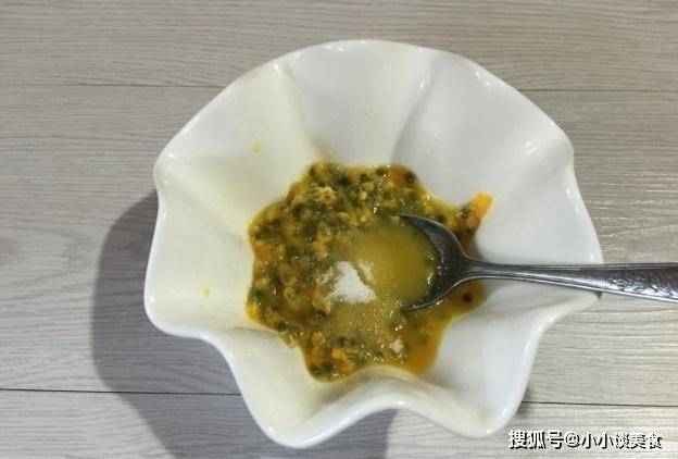 第三步:因為百香果比較酸,可以在百香果裡放少許糖,事先攪拌一下,這樣百香果的口感會更好。所有材料處理好後,取出準備好的榨汁機,先將切好的蓮霧放入榨汁機中,倒入少量牛奶,將蓮霧榨成汁,再放入百香果。