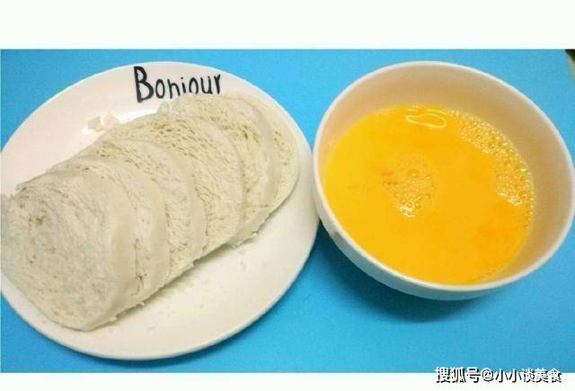 然後我們處理饅頭。將饅頭切成8片,將之前打好的雞蛋打碎,用蛋液覆蓋饅頭,然後下鍋煎至饅頭兩面金黃。黃色,最後把它拿出來,這樣我們漢堡的外皮就做好瞭!