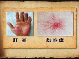 首先最明顯的是"肝掌"或蜘蛛痣。慢性肝炎或肝硬化患者手掌大小魚際充血或有紅色斑塊且形式肝臟而被稱為"肝掌",一般按壓紅斑部位會變為蒼白色。皮膚上可見毛細血管擴張放射狀如同"蜘蛛痣",此症狀提示肝功能衰竭且同樣按壓後會褪色。