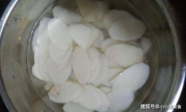 3、將切好的芋頭浸入水中。我們在切山藥的時候可以把山藥切得越厚越好,這樣在煮的過程中才不會斷掉。