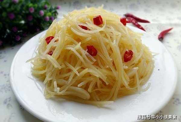 土豆泥炒一會後,因為是大火快炸,先泡水,所以土豆泥很快就熟瞭,然後就可以調味瞭。調味時,先加入適量的鹽和雞精翻炒均勻。出鍋前,從鍋邊倒入適量香醋,然後快速炒出醋香,使土豆泥熟透均勻,香醋的香味和酸味融為一體。一定要從鍋的側面倒,因為醋接觸鍋壁的高溫會激發醋的香氣。如果直接倒在磨碎的土豆上,磨碎的土豆嘗起來會有點醋味而不是酸味。味道香辣可口。