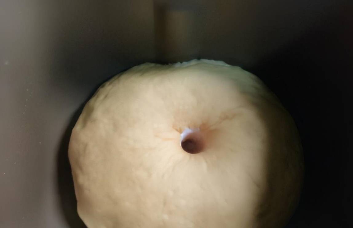 7、發酵至兩倍大以後,用手在面團中間戳出來一個洞,如果不回彈,就是發酵好瞭。