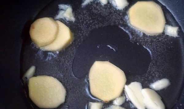 3、鍋中燒熱油,把準備好的薑蒜下鍋翻炒,炒出香味。