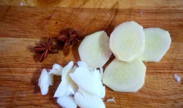 2、主料處理好之後,再準備一下去腥的輔料。蔥薑蒜改刀切好自然是不用多說,大料也不用準備太多,兩三個足矣,如果香辛料充沛的話,多準備一片香葉,也小塊桂皮自然是更好。