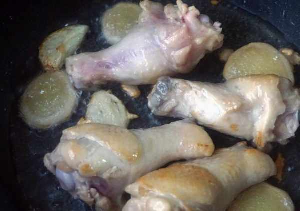 4、接著就加入清洗好的雞翅根。加入之後中小火慢慢煸炒,炒出雞皮下蘊藏的油脂,這樣炒好之後,能讓做好的雞翅根不會有油膩的感覺。
