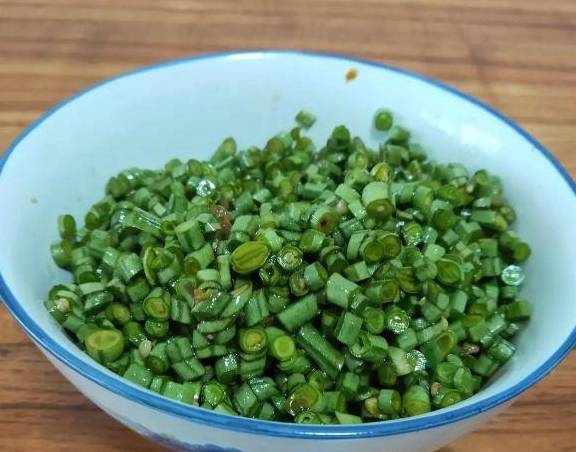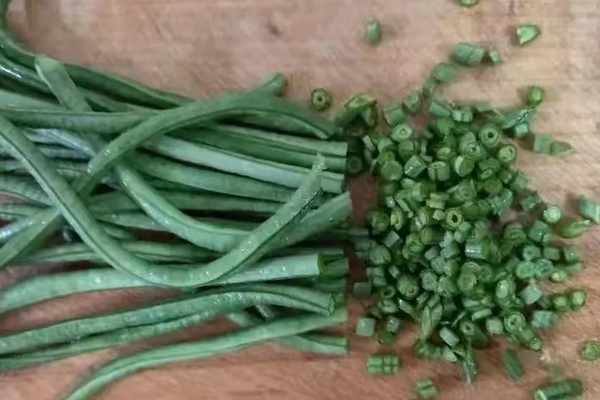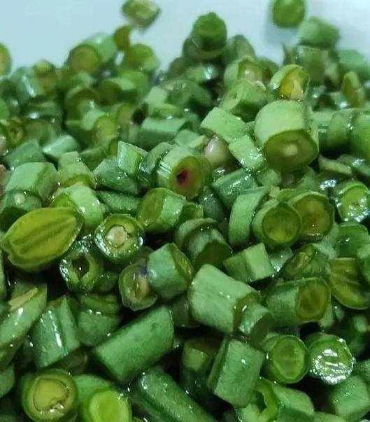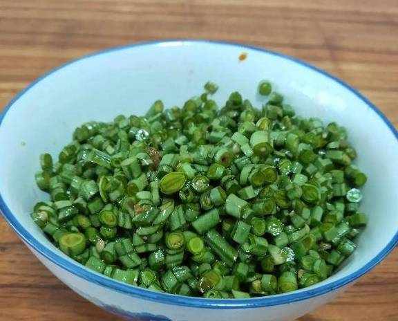 步驟:1、將新鮮的豆角冼凈,用開水煮至青色,撈出來瀝水後切段。