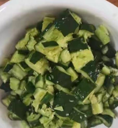 3、將切碎的黃瓜塊放入盆內,加少許鹽攪拌均勻,再倒入蒜汁拌勻即可食用。
