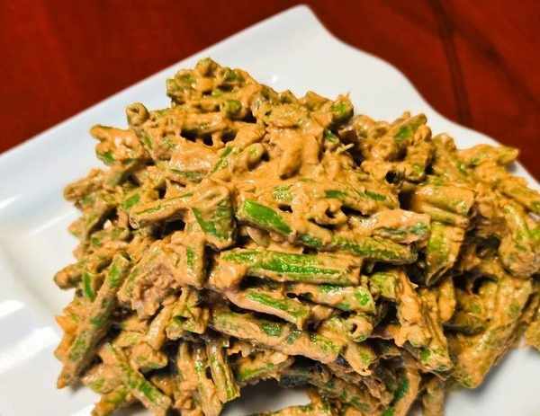 食材:鮮豆角、麻醬、蒜、鹽、香油